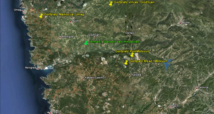 Über 20 Golfplätze sind auf der Halbinsel Istrien geplant und schon genehmigt. Die Golfplätze in der Umgebung von Grožnjan - Golfplatz Vrnjak - 2 x 18 Löcher, Größe 80 ha, 40 Jahre Konzession - Golfplatz Brkač (bei Motovun) - 2 x 18 Löcher, Größe 120-150 ha, dieser Golfplatz ist schon seit kurzem in Betrieb - und Markocija (bei Umag), Größe 117 ha. Die Entfernungen zu diesen Plätzen betragen alle zwischen rund 10 und 20 km mit dem Auto.